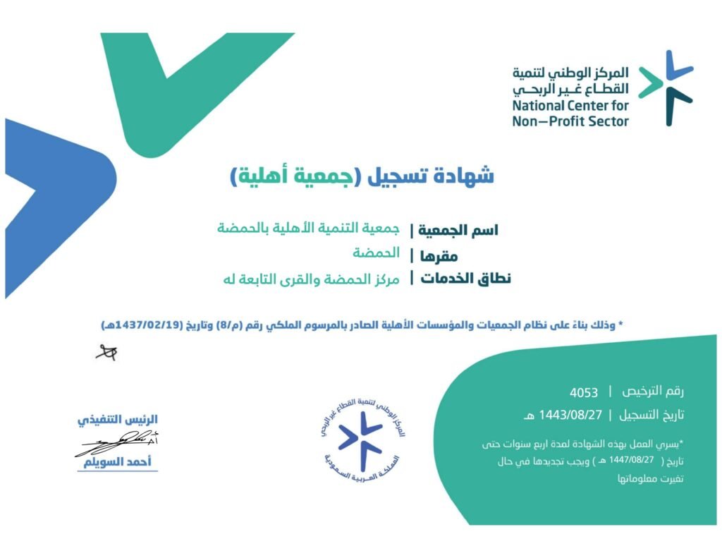 تأسست جمعية التنمية الأهلية بالحمضة برقم (4053) وتاريخ 27 /08 /1443 هـ